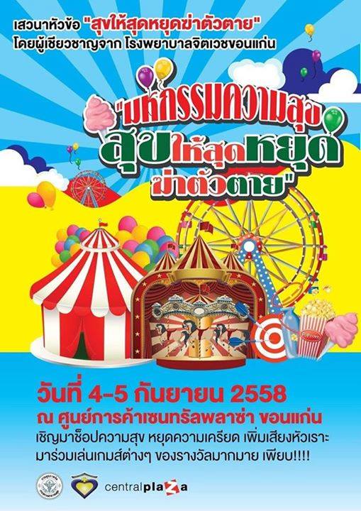 วันป้องกันการฆ่าตัวตายโลก "สุขให้สุด หยุดฆ่าตัวตาย" มหกรรมความสุขเพื่อให้ทุกคนหยุดฆ่าตัวตาย ระหว่างวันที่ 4-5 กันยายนศกนี้ (ห้างเปิดยันห้างปิด) พบกันที่ ศูนย์การค้าเซนทรัลพลาซ่าขอนแก่น เรามีความสุข สนุกสนาน พร้อมด้วยสาระความรู้ แถมเสียงหัวเราะ และยังให้เล่นเกมส์ฟรีๆ แล้วรับของรางวัลมากมายยยยยย (ย.ยักษ์ ล้านตัว) มหกรรมความสุขพร้อมความรู้แบบนี้ พลาดไม่ได้ แล้วเตรียมตัวมาพบกัน อย่าลืมด้วยนะครับว่า #สุขให้สุดหยุดฆ่าตัวตาย
