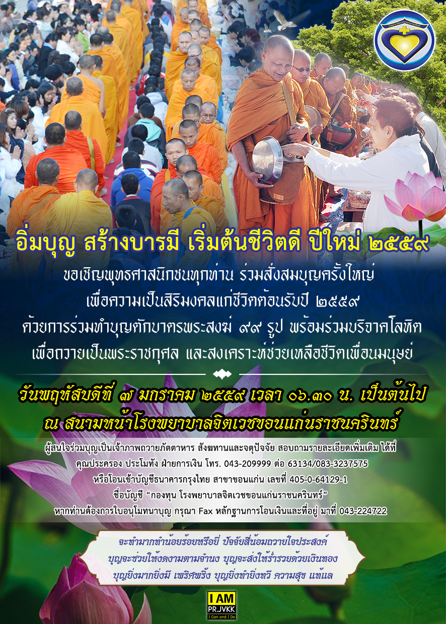 ขอเชิญร่วมทำบุญตักบาตรเนื่องในวันขึ้นปีใหม่ พุทธศักราช ๒๕๕๙ ณ โรงพยาบาลจิตเวชขอนแก่นราชนครินทร์ วันอาทิตย์ที่ ๗ มกราคม พ.ศ. ๒๕๕๙เนื่องด้วยในทุกๆ ปีโรงพยาบาลจิตเวชขอนแก่นราชนครินทร์ได้มีการกิจกรรมทางพระพุทธศาสนาโดยร่วมกับชุมชนใกล้เคียงเพื่อร่วมสายบุญในการทำนุบำรุงศาสนาจึงขอเรียนเชิญผู้ที่สนใจร่วมบุญดังรายละเอียดที่แนบ posterนี้