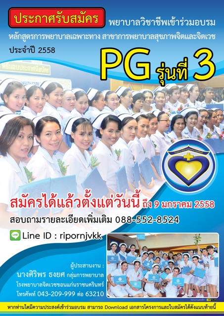 ด้วยโรงพยาบาลจิตเวชขอนแก่นราชนคริทร์ ร่วมกับคณะพยาบาลศาสตร์ มหาวิทยาลัยขอนแก่น กำหนดจัดหลักสูตรการพยาบาลเฉพาะทางสาขาการพยาบาลสุขภาพจิตและจิตเวช รุ่นที่ 3 จำนวน 40 คน ในระหว่าง วันที่ 2 กุมภาพันธ์ 2558 - 29 พฤษภาคม 2558 ณ. โรงพยาบาลจิตเวชขอนจแก่นราชนครินทร์ ซึ่งรายละเอียดของหลักสูตร และขั้นตอนการสมมัคร สามารถ download ตามแนบท้ายมานี้ หากมีข้อสังสัยติดต่อโดยตรงที่ คุณ ศิริพร ทองยศ 088 - 552-8524 หรือ 043 209 -999 ต่อ 63210