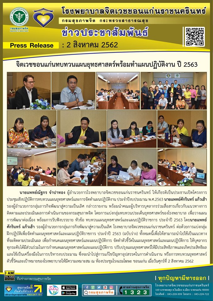 นายแพทย์ณัฐกร จำปาทอง ผู้อำนวยการโรงพยาบาลจิตเวชขอนแก่นราชนครินทร์ ให้เกียรติเป็นประธานเปิดโครงการประชุมเชิงปฏิบัติการทบทวนแผนยุทธศาสตร์และการจัดทำแผนปฏิบัติงาน ประจำปีงบประมาณ พ.ศ.2563 นายแพทย์ศักรินทร์ แก้วเฮ้า รองผู้อำนวยการกลุ่มภารกิจพัฒนาสู่ความเป็นเลิศ กล่าวรายงาน พร้อมนำคณะผู้บริหารบุคลากรร่วมสื่อสารเกี่ยวกับแนวทางการติดตามและประเมินผลการดำเนินงานของกรมสุขภาพจิต โดยการแบ่งกลุ่มทบทวนประเด็นยุทธศาสตร์ของโรงพยาบาล เพื่อวางแผนการพัฒนาต่อเนื่อง พร้อมการรับฟังบรรยาย หัวข้อ ทบทวนแผนยุทธศาสตร์และแผนปฏิบัติราชการ ประจำปี 2563 โดยนายแพทย์ศักรินทร์ แก้วเฮ้า รองผู้อำนวยการกลุ่มภารกิจพัฒนาสู่ความเป็นเลิศ โรงพยาบาลจิตเวชขอนแก่นราชนครินทร์ ต่อด้วยการแบ่งกลุ่มฝึกปฏิบัติเพื่อจัดทำแผนยุทธศาสตร์และแผนปฏิบัติราชการ ประจำปี 2563 (ฉบับร่าง) ทั้งหมดนี้เพื่อให้สามารถนำไปใช้เป็นแนวทางที่จะติดตามประเมินผล เพื่อกำหนดแผนยุทธศาสตร์และแผนปฏิบัติการ จัดทำตัวชี้วัดในแผนยุทธศาสตร์และแผนปฏิบัติการ ให้บุคลากรทุกระดับได้มีส่วนร่วมในการกำหนดแผนยุทธศาสตร์และแผนปฏิบัติการ ปรับปรุงแผนยุทธศาสตร์ให้มีประสิทธิภาพและเกิดประสิทธิผล และใช้เป็นเครื่องมือในการบริหารงบประมาณ ซึ่งจะนำไปสู่การแก้ไขปัญหาอุปสรรคในการดำเนินงาน หรือการทบทวนยุทธศาสตร์ ตัวชี้วัดและเป้าหมายของโรงพยาบาลให้มีความเหมาะสม ณ ห้องประชุมโรงแรมโฆษะ ขอนแก่น เมื่อวันศุกร์ที่ 2 สิงหาคม 2562