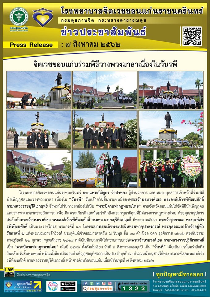 โรงพยาบาลจิตเวชขอนแก่นราชนครินทร์ นายแพทย์ณัฐกร จำปาทอง ผู้อำนวยการ มอบหมายบุคลากรเจ้าหน้าที่ร่วมพิธีบำเพ็ญกุศลและวางพวงมาลา เนื่องใน “วันรพี” วันคล้ายวันสิ้นพระชนม์ของพระเจ้าบรมวงศ์เธอ พระองค์เจ้ารพีพัฒนศักดิ์ กรมหลวงราชบุรีดิเรกฤทธิ์ ซึ่งทรงได้รับการยกย่องให้เป็น “พระบิดาแห่งกฎหมายไทย” ศาลจังหวัดขอนแก่นได้จัดพิธีบำเพ็ญกุศลและวางพวงมาลาถวายสักการะ เพื่อเทิดพระเกียรติและน้อมรำลึกถึงพระกรุณาธิคุณที่มีต่อวงการกฎหมายไทย ด้วยคุณาณุปการอันล้นพ้นพระเจ้าบรมวงศ์เธอ พระองค์เจ้ารพีพัฒนศักดิ์ กรมหลวงราชบุรีดิเรกฤทธิ์ มีพระนามเดิมว่า พระเจ้าลูกยาเธอ พระองค์เจ้ารพีพัฒนศักดิ์ เป็นพระราชโอรส พระองค์ที่ ๑๔ ในพระบาทสมเด็จพระปรมินทรมหาจุฬาลงกรณ์ พระจุลจอมเกล้าเจ้าอยู่หัว รัชกาลที่ ๕ แห่งพระบรมราชจักรีวงศ์ ประสูติแต่เจ้าจอมมารดาตลับ ณ วันพุธ ขึ้น ๑๑ ค่ำ ปีจอ ฉศก จุลศักราช ๑๒๓๖ ตรงกับวาระทางสุริยคติ ๒๑ ตุลาคม พุทธศักราช ๒๔๑๗ เนติบัณฑิตยสภาจึงได้ถวายการยกย่องพระเจ้าบรมวงศ์เธอ กรมหลวงราชบุรีดิเรกฤทธิ์ เป็น “พระบิดาแห่งกฎหมายไทย” เมื่อปี ๒๔๙๗ ทั้งเร่ิมต้นเรียก วันที่ ๗ สิงหาคมของทุกปี เป็น “วันรพี” เพื่อเป็นการน้อมรำลึกถึงวันคล้ายวันสิ้นพระชนม์ พร้อมทั้งมีการจัดงานบำเพ็ญกุศลอุทิศถวายเป็นประจำทุกปี ณ บริเวณหน้าอนุสาวรีย์พระบรมวงศ์เธอพระองค์เจ้ารพีพัฒนศักดิ์ กรมหลวงราชบุรีดิเรกฤทธิ์ หน้าศาลจังหวัดขอนแก่น เมื่อเช้าวันพุธที่ ๗ สิงหาคม ๒๕๖๒