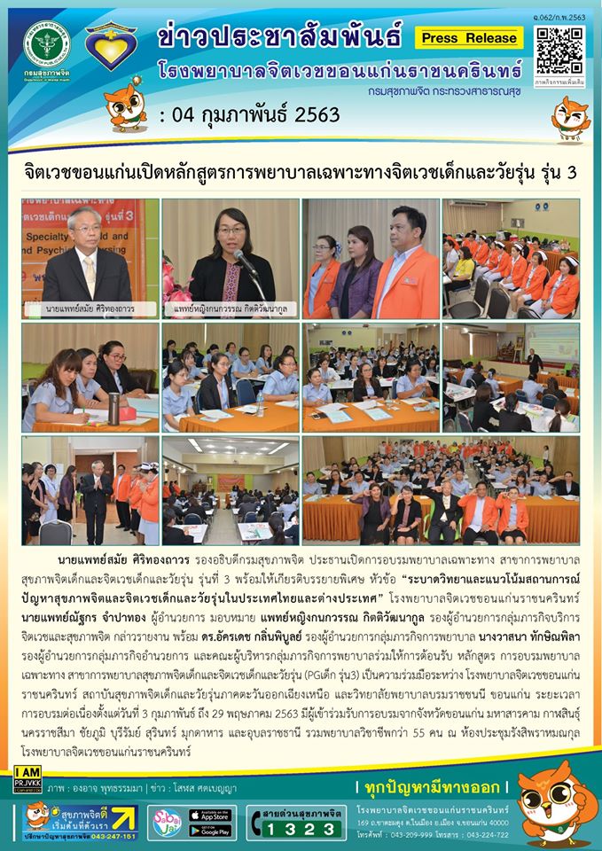 เมื่อวันที่4 กุมภาพันธ์ 2563 จิตเวชขอนแก่นเปิดหลักสูตรการพยาบาลเฉพาะทางจิตเวชเด็กและวัยรุ่น รุ่น 3 นายแพทย์สมัย ศิริทองถาวร รองอธิบดีกรมสุขภาพจิต ให้เกียรติเป็นประธานฯ ผู้เข้าอบรมกว่า 55 คน ณ ห้องประชุมรังสิพราหมณกุล โรงพยาบาลจิตเวชขอนแก่นราชนครินทร์