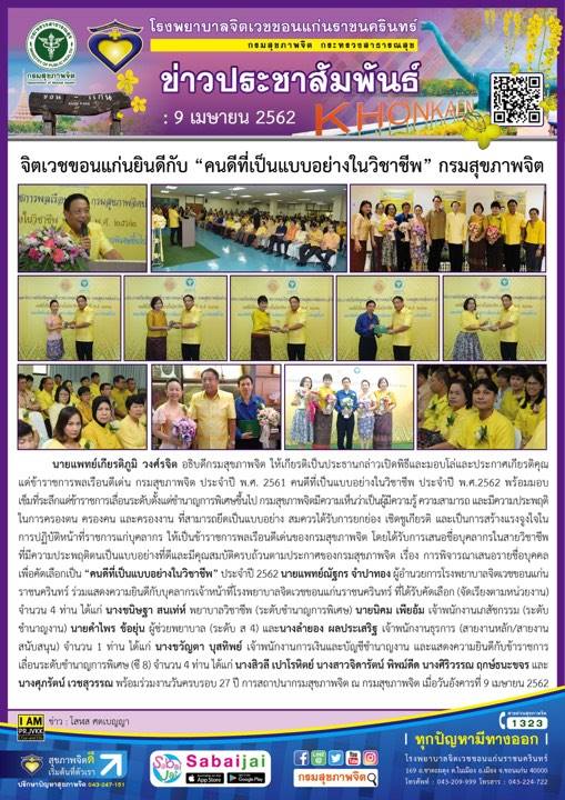 ขอร่วมแสดงความยินดีกับ "คนดีที่เป็นแบบอย่างในวิชาชีพ" กรมสุขภาพจิต ประจำปี 2562 โดยได้รับการเสนอชื่อบุคลากรในสายวิชาชีพที่มีความประพฤติตนเป็นแบบอย่างที่ดีและมีคุณสมบัติครบถ้วนตามประกาศกรมสุขภาพจิต ในโอกาศนี้ นายแพทย์ณัฐกร จำปาทอง ผู้อำนวยการโรงพยาบาลจิตเวชขอนแก่นราชนครินทร์ ดร.อัครเดช กลิ่นพิบูลย์ รองผู้อำนวยการด้านการพยาบาล และ นางสาววาสนา ทักษิณพิลา รองผู้อำนวยการกลุ่มภารกิจอำนวยการ ได้ร่วมให้กำลังใจและชื่นชมในความคุณงานความดีของบุคลากรคนดีที่เป็นแบบอย่างในวิชาชีพ