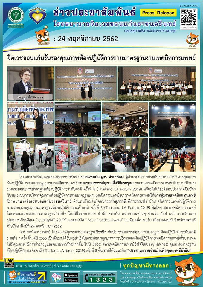 โรงพยาบาลจิตเวชขอนแก่นราชนครินทร์ นายแพทย์ณัฐกร จำปาทอง ผู้อำนวยการ ยกระดับระบบการบริหารคุณภาพห้องปฏิบัติการตามมาตรฐานงานเทคนิคการแพทย์ ศาสตราจารย์ยุพา เอื้อวิจิตรอรุณ นายกสภาเทคนิคการแพทย์ ประธานเปิดงานมหกรรมคุณภาพมาตรฐานห้องปฏิบัติการระดับชาติ ครั้งที่ 8 (Thailand LA Forum 2019) พร้อมให้เกียรติมอบประกาศนียบัตรรับรองระบบการบริหารคุณภาพห้องปฏิบัตการตามมาตรฐานงานเทคนิคการแพทย์ สภาเทคนิคการแพทย์ ให้แก่ กลุ่มงานเทคนิคการแพทย์ โรงพยาบาลจิตเวชขอนแก่นราชนครินทร์ ตัวแทนรับมอบโดยนางสาวสุภาวดี ดีการกระทำ นักเทคนิคการแพทย์ปฏิบัติการ งานมหกรรมคุณภาพมาตรฐานห้องปฏิบัติการระดับชาติ ครั้งที่ 8 (Thailand LA Forum 2019) จัดโดย สภาเทคนิคการแพทย์ โดยคณะอนุกรรมการมาตรฐานวิชาชีพ โดยมีโรงพยาบาล สำนัก สถาบัน หน่วยงานต่างๆ จำนวน 244 แห่ง ร่วมรับมอบประกาศเกียรติคุณ “QualityMT 2019” และรางวัล “Best Practice Award” ณ อิมแพ็ค ฟอรั่ม เมืองทองธานี จังหวัดนนทบุรี เมื่อวันอาทิตย์ที่ 24 พฤศจิกายน 2562