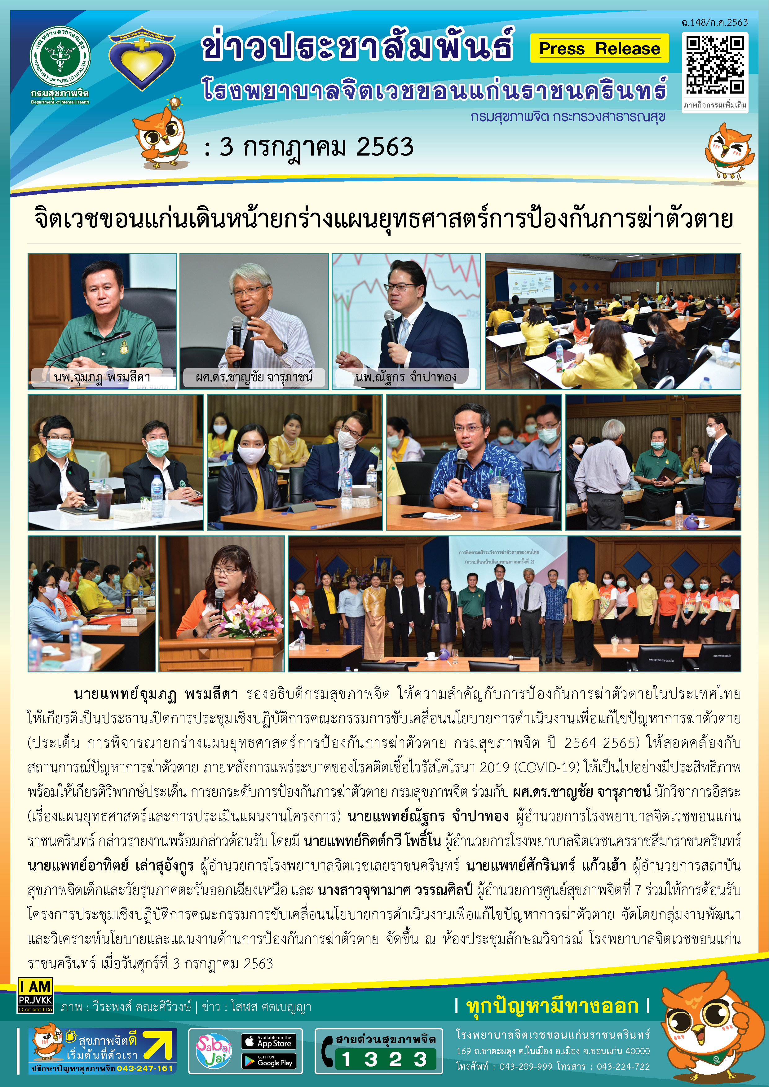 นายแพทย์จุมภฏ พรมสีดา รองอธิบดีกรมสุขภาพจิต ให้ความสำคัญกับการป้องกันการฆ่าตัวตายในประเทศไทยให้เกียรติเป็นประธานเปิดการประชุมเชิงปฏิบัติการคณะกรรมการขับเคลื่อนนโยบายการดำเนินงานเพื่อแก้ไขปัญหาการฆ่าตัวตาย (ประเด็น การพิจารณายกร่างแผนยุทธศาสตร์การป้องกันการฆ่าตัวตาย กรมสุขภาพจิต ปี 2564-2565) ให้สอดคล้องกับสถานการณ์ปัญหาการฆ่าตัวตาย ภายหลังการแพร่ระบาดของโรคติดเชื้อไวรัสโคโรนา 2019 (COVID-19) ให้เป็นไปอย่างมีประสิทธิภาพ พร้อมให้เกียรติวิภาคประเด็น การยกระดับการป้องกันการฆ่าตัวตาย กรมสุขภาพจิต ร่วมกับ ผศ.ดร.ชาญชัย จารุภาชน์ นักวิชาการอิสระ (เรื่องแผนยุทธศาสตร์และการประเมินแผนงานโครงการ) นายแพทย์ณัฐกร จำปาทอง ผู้อำนวยการโรงพยาบาลจิตเวชขอนแก่นราชนครินทร์ กล่าวรายงานพร้อมกล่าวต้อนรับ โดยมี นายแพทย์กิตต์กวี โพธิ์โน ผู้อำนวยการโรงพยาบาลจิตเวชนครราชสีมาราชนครินทร์ นายแพทย์อาทิตย์ เล่าสุอังกูร ผู้อำนวยการโรงพยาบาลจิตเวชเลยราชนครินทร์ นายแพทย์ศักรินทร์ แก้วเฮ้า ผู้อำนวยการสถาบันสุขภาพจิตเด็กและวัยรุ่นภาคตะวันออกเฉียงเหนือ นางสาวจุฑามาศ วรรณศิลป์ ผู้อำนวยการศูนย์สุขภาพจิตที่ 7 ร่วมให้การต้อนรับ โครงการประชุมเชิงปฏิบัติการคณะกรรมการขับเคลื่อนนโยบายการดำเนินงานเพื่อแก้ไขปัญหาการฆ่าตัวตาย จัดโดยกลุ่มงานพัฒนาและวิเคราะห์นโยบายและแผนงานป้องกันการฆ่าตัวตาย จัดขึ้น ณ ห้องประชุมลักษณวิจารณ์ โรงพยาบาลจิตเวชขอนแก่นราชนครินทร์ เมื่อวันศุกร์ที่ 3 กรกฎาคม 2563