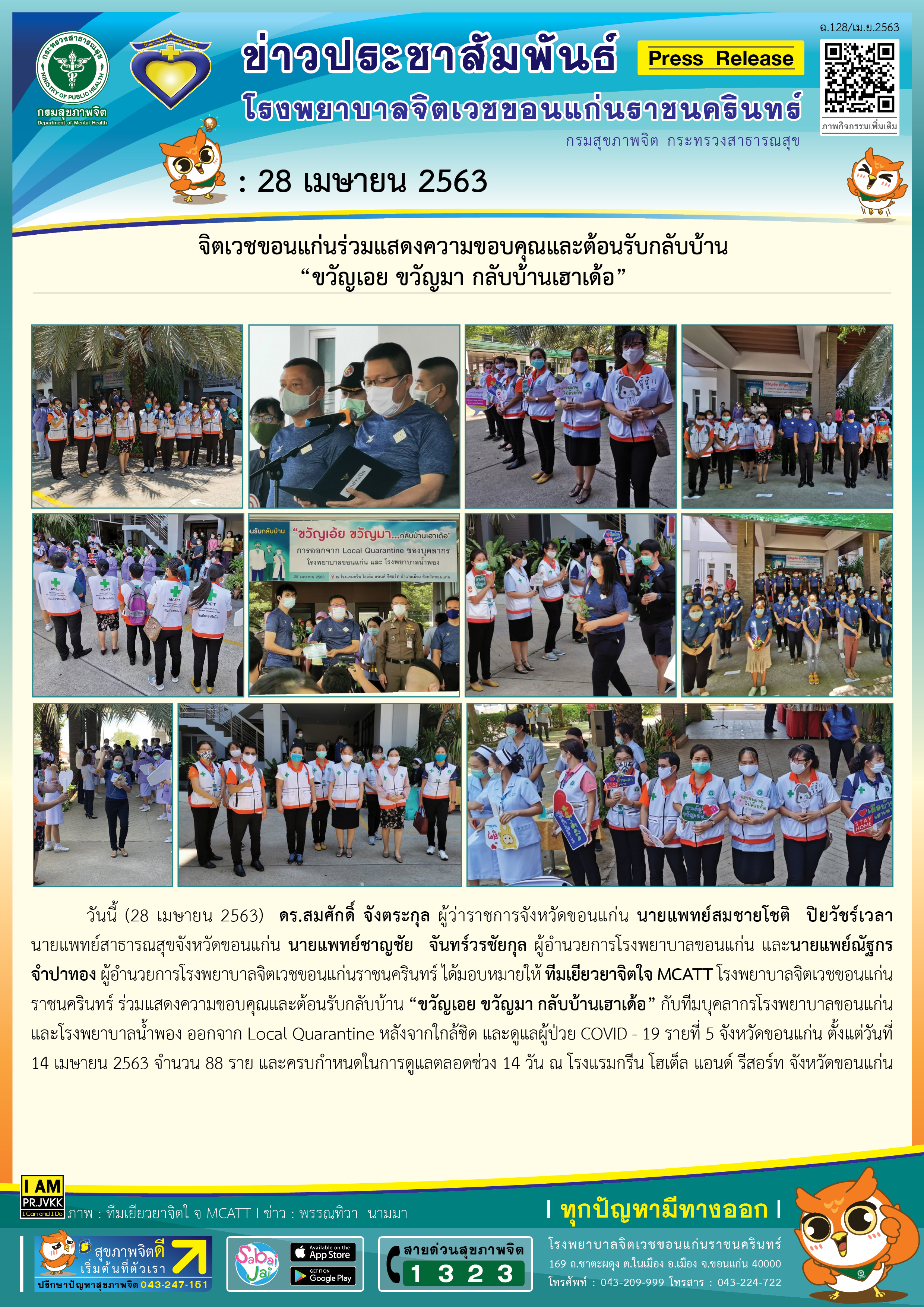 โรงพยาบาลจิตเวชขอนแก่นราชนครินทร์ ทีม MCATT จิตเวช ขอบคุณผู้ที่อยู่เบื้องหน้าและเบื้องหลังทุกท่าน ที่สนับสนุนและเอื้ออำนวย ในการปฏิบัติภารกิจการดูแลจิตใจบุคลากรทางการเเพทย์ เฝ้าระวังสุขภาพ14 วัน ให้สำเร็จลุล่วงไปได้ด้วยดี ทีม MCATT จิตเวช ที่เราและทีมสหวิชาชีพชาวสุขภาพจิตภาคภูมิใจ ที่เป็นส่วนหนึ่งในภารกิจดูแลจิตใจฮีโรทุกท่าน ใช้องค์ความรู้หลักการบำบัดช่วยให้น้องมองเห็นเข้าใจปัญหาและมีแนวทางแก้ไขปัญหาที่แท้จริง