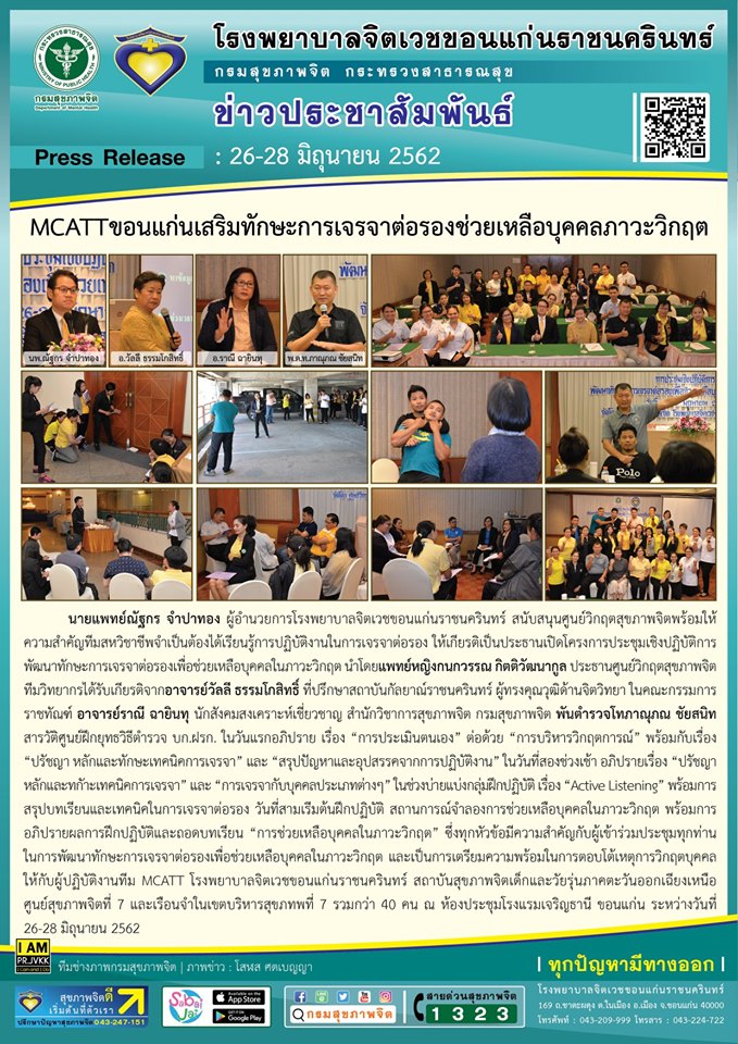 นายแพทย์ณัฐกร จำปาทอง ผู้อำนวยการโรงพยาบาลจิตเวชขอนแก่นราชนครินทร์ สนับสนุนศูนย์วิกฤตสุขภาพจิตพร้อมให้ความสำคัญทีมสหวิชาชีพจำเป็นต้องได้เรียนรู้การปฏิบัติงานในการเจรจาต่อรอง ให้เกียรติเป็นประธานเปิดโครงการประชุมเชิงปฏิบัติการพัฒนาทักษะการเจรจาต่อรองเพื่อช่วยเหลือบุคคลในภาวะวิกฤต นำโดยแพทย์หญิงกนกวรรณ กิตติวัฒนากูล ประธานศูนย์วิกฤตสุขภาพจิต ทีมวิทยากรได้รับเกียรติจากอาจารย์วัลลี ธรรมโกสิทธิ์ ที่ปรึกษาสถาบันกัลยาณ์ราชนครินทร์ ผู้ทรงคุณวุฒิด้านจิตวิทยา ในคณะกรรมการราชทัณฑ์ อาจารย์ราณี ฉายินทุ นักสังคมสงเคราะห์เชี่ยวชาญ สำนักวิชาการสุขภาพจิต กรมสุขภาพจิต พันตำรวจโทภาณุภณ ชัยสนิท สารวัติศูนย์ฝึกยุทธวิธีตำรวจ บก.ฝรก. ในวันแรกอภิปราย เรื่อง “การประเมินตนเอง” ต่อด้วย “การบริหารวิกฤตการณ์” พร้อมกับเรื่อง “ปรัชญา หลักและทักษะเทคนิคการเจรจา” และ “สรุปปัญหาและอุปสรรคจากการปฏิบัติงาน” ในวันที่สองช่วงเช้า อภิปรายเรื่อง “ปรัชญา หลักและทกัาะเทคนิคการเจรจา” และ “การเจรจากับบุคคลประเภทต่างๆ” ในช่วงบ่ายแบ่งกลุ่มฝึกปฏิบัติ เรื่อง “Active Listening” พร้อมการสรุปบทเรียนและเทคนิคในการเจรจาต่อรอง วันที่สามเร่ิมต้นฝึกปฏิบัติ สถานการณ์จำลองการช่วยเหลือบุคคลในภาวะวิกฤต พร้อมการอภิปรายผลการฝึกปฏิบัติและถอดบทเรียน “การช่วยเหลือบุคคลในภาวะวิกฤต” ซึ่งทุกหัวข้อมีความสำคัญกับผู้เข้าร่วมประชุมทุกท่านในการพัฒนาทักษะการเจรจาต่อรองเพื่อช่วยเหลือบุคคลในภาวะวิกฤต และเป็นการเตรียมความพร้อมในการตอบโต้เหตุการวิกฤตบุคคลให้กับผู้ปฏิบัติงานทีม MCATT โรงพยาบาลจิตเวชขอนแก่นราชนครินทร์ สถาบันสุขภาพจิตเด็กและวัยรุ่นภาคตะวันออกเฉียงเหนือ ศูนย์สุขภาพจิตที่ 7 และเรือนจำในเขตบริหารสุขภทพที่ 7 รวมกว่า 40 คน ณ ห้องประชุมโรงแรมเจริญธานี ขอนแก่น ระหว่างวันที่ 26-28 มิถุนายน 2562