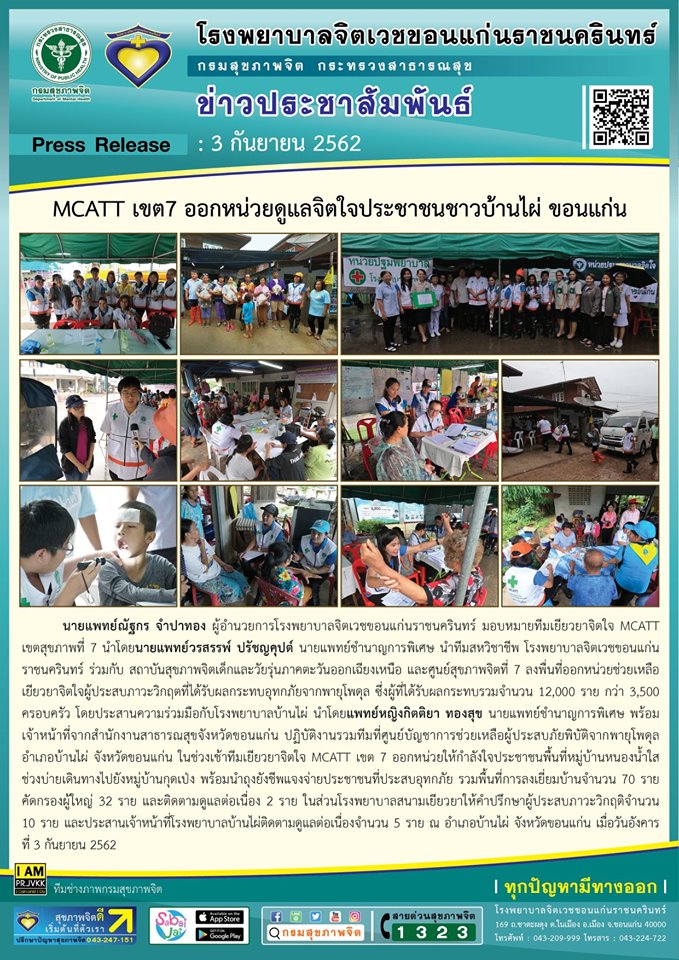 นายแพทย์ณัฐกร จำปาทอง ผู้อำนวยการโรงพยาบาลจิตเวชขอนแก่นราชนครินทร์ มอบหมายทีมเยียวยาจิตใจ MCATT เขตสุขภาพที่ 7 นำโดยนายแพทย์วรสรรพ์ ปรัชญคุปต์ นายแพทย์ชำนาญการพิเศษ นำทีมสหวิชาชีพ โรงพยาบาลจิตเวชขอนแก่นราชนครินทร์ ร่วมกับ สถาบันสุขภาพจิตเด็กและวัยรุ่นภาคตะวันออกเฉียงเหนือ และศูนย์สุขภาพจิตที่ 7 ลงพื่นที่ออกหน่วยช่วยเหลือเยียวยาจิตใจผู้ประสบภาวะวิกฤตที่ได้รับผลกระทบอุทกภัยจากพายุโพดุล ซึ่งผู้ที่ได้รับผลกระทบรวมจำนวน 12,000 ราย กว่า 3,500 ครอบครัว โดยประสานความร่วมมือกับโรงพยาบาลบ้านไผ่ นำโดยแพทย์หญิงกิตติยา ทองสุข นายแพทย์ชำนาญการพิเศษ พร้อมเจ้าหน้าที่จากสำนักงานสาธารณสุขจังหวัดขอนแก่น ปฏิบัติงานรวมทีมที่ศูนย์บัญชาการช่วยเหลือผู้ประสบภัยพิบัติจากพายุโพดุล อำเภอบ้านไผ่ จังหวัดขอนแก่น ในช่วงเช้าทีมเยียวยาจิตใจ MCATT เขต 7 ออกหน่วยให้กำลังใจประชาชนพื้นที่หมู่บ้านหนองน้ำใส ช่วงบ่ายเดินทางไปยังหมู่บ้านกุดเป่ง พร้อมนำถุงยังชีพแจงจ่ายประชาชนที่ประสบอุทกภัย รวมพื้นที่การลงเยี่ยมบ้านจำนวน 70 ราย คัดกรองผู้ใหญ่ 32 ราย และติดตามดูแลต่อเนื่อง 2 ราย ในส่วนโรงพยาบาลสนามเยียวยาให้คำปรึกษาผู้ประสบภาวะวิกฤติจำนวน 10 ราย และประสานเจ้าหน้าที่โรงพยาบาลบ้านไผ่ติดตามดูแลต่อเนื่องจำนวน 5 ราย ณ อำเภอบ้านไผ่ จังหวัดขอนแก่น เมื่อวันอังคารที่ 3 กันยายน 2562
