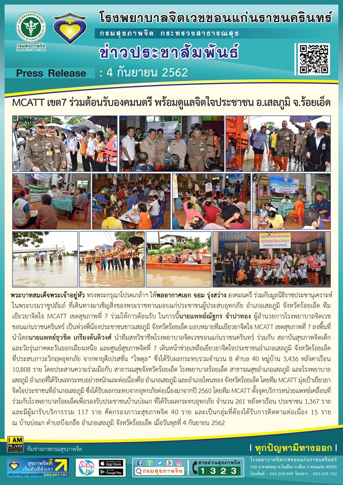 พระบาทสมเด็จพระเจ้าอยู่หัว ทรงพระกรุณาโปรดเกล้าฯ ให้พลอากาศเอก จอม รุ่งสว่าง องคมนตรี ร่วมกับมูลนิธิราชประชานุเคราะห์ ในพระบรมราชูปถัมภ์ ที่เดินทางมาเชิญสิ่งของพระราชทานมอบแก่ประชาชนผู้ประสบอุทกภัย อำเภอเสลภูมิ จังหวัดร้อยเอ็ด ทีมเยียวยาจิตใจ MCATT เขตสุขภาพที่ 7 ร่วมให้การต้อนรับ ในการนี้นายแพทย์ณัฐกร จำปาทอง ผู้อำนวยการโรงพยาบาลจิตเวชขอนแก่นราชนครินทร์ เป็นห่วงพี่น้องประชาชนชาวเสลภูมิ จังหวัดร้อยเอ็ด มอบหมายทีมเยียวยาจิตใจ MCATT เขตสุขภาพที่ 7 ลงพื้นที่ นำโดยนายแพทย์ธุวชิต เกรียงตันติวงศ์ นำทีมสหวิชาชีพโรงพยาบาลจิตเวชขอนแก่นราชนครินทร์ ร่วมกับ สถาบันสุขภาพจิตเด็กและวัยรุ่นภาคตะวันออกเฉียงเหนือ และศูนย์สุขภาพจิตที่ 7 เดินหน้าช่วยเหลือเยียวยาจิตใจประชาชนอำเภอเสลภูมิ จังหวัดร้อยเอ็ดที่ประสบภาวะวิกฤตอุทกภัย จากพายุดีเปรสชั่น “โพดุล” ซึ่งได้รับผลกระทบรวมจำนวน 8 ตำบล 40 หมู่บ้าน 3,436 หลังคาเรือน 10,808 ราย โดยประสานความร่วมมือกับ สาธารณสุขจังหวัดร้อยเอ็ด โรงพยาบาลร้อยเอ็ด สาธารณสุขอำเภอเสลภูมิ และโรงพยาบาลเสลภูมิ อำเภอที่ได้รับผลกระทบอยากหนักและต่อเนื่องคือ อำเภอเสลภูมิ และอำเภอโพนทอง จังหวัดร้อยเอ็ด โดยทีม MCATT มุ่งเป้าเยียวยาจิตใจประชาชนที่อำเภอเสลภูมิ ซึ่งได้รับผลกระทบจากอุทกภัยต่อเนื่องมาจากปี 2560 โดยทีม MCATT ตั้งจุดโรงพยาบาลสนามร่วมกับโรงพยาบาลร้อยเอ็ดเพื่อรองรับประชาชนบ้านบ่อแก ที่ได้รับผลกระทบอุทกภัย จำนวน 261 หลังคาเรือน ประชาชน 1,367 ราย และมีผู้มารับบริการรวม 117 ราย คัดกรองภาวะสุขภาพจิต 40 ราย และเป็นกลุ่มที่ต้องได้รับการติดตามต่อเนื่อง 15 ราย ณ วัดโกศรีกัญญาราม บ้านบ่อแก ตำบลบึงเกลือ อำเภอเสลภูมิ จังหวัดร้อยเอ็ด เมื่อวันพุธที่ 4 กันยายน 2562