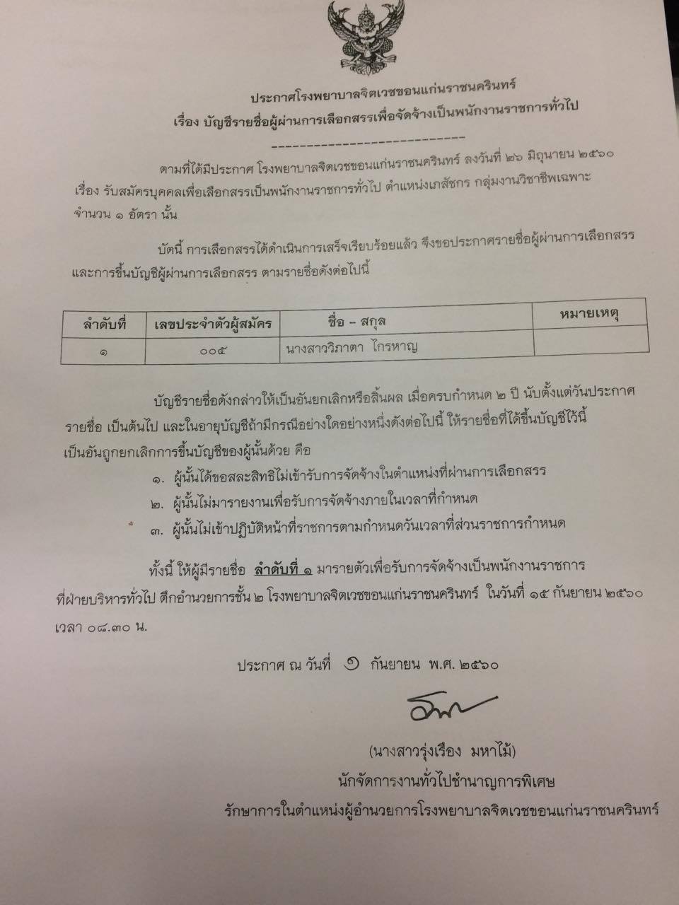 ประกาศรายชื่อผู้ผ่านการเลือกสรรเพื่อจัดจ้างเป็นพนักงานราชการทั่วไป ตำแหน่งเภสัชกร