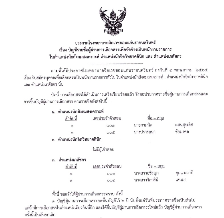 ประกาศรายชื่อผู้ผ่านการเลือกสรร นักสังคมสงเคราะห์ เภสัชกร