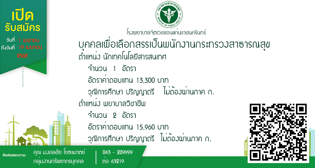 5) จำนวน 2 อัตรา 6) อัตราค่าตอบแทน 15,960 บาท 7) วุฒิการศึกษา ปริญญาตรี ไม่ต้องผ่านภาค ก. 8) สถานที่ปฏิบัติงาน โรงพยาบาลจิตเวชขอนแก่นราชนครินทร์ เลขที่ 169หมู่ 4 ถนนชาตะผดุง อำเภอเมือง จังหวัดขอนแก่น 40000 9) รับสมัคร ตั้งแต่วันที่ 1 - 19 เมษายน 2562 10) ยื่นใบสมัครด้วยตนเองได้ที่ กลุ่มงานทรัพยรบุคคล อาคารอำนวยการ ชั้น2 โรงพยาบาลจิตเวชขอนแก่นราชนครินทร์ จังหวัดขอนแก่น ในวันและเวลาราชการ