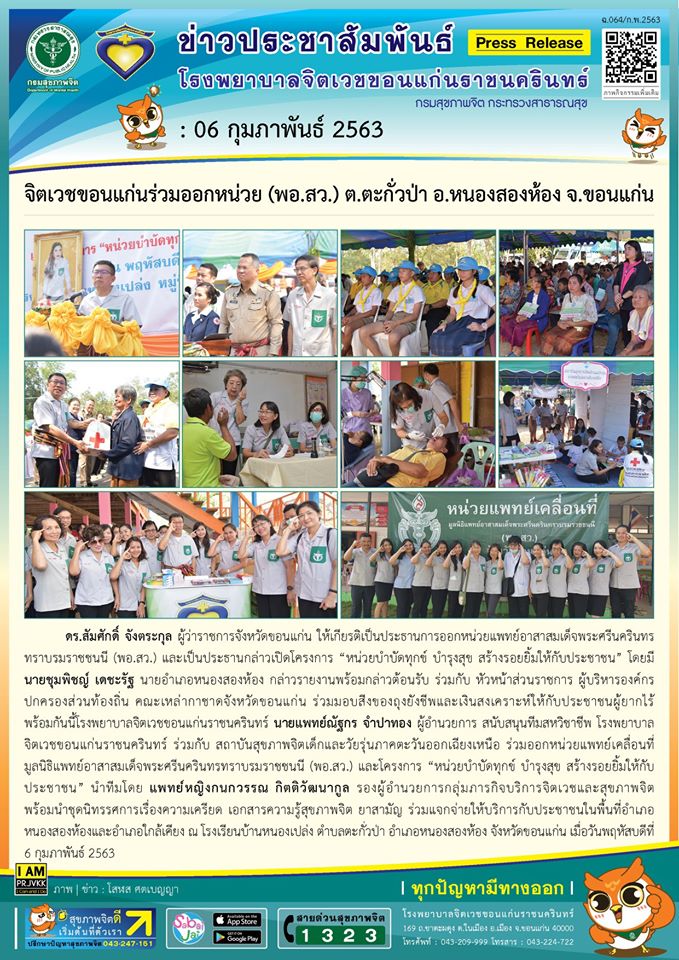 เมื่อวันที่ 6 กุมภาพันธ์ 2563 จิตเวชขอนแก่นร่วมกับ สถาบันสุขภาพจิตเด็กฯ ร่วมออกหน่วย (พอ.สว.) และโครงการ “หน่วยบำบัดทุกข์ บำรุงสุข สร้างรอยยิ้มให้กับประชาชน” ให้บริการประชาชนในพื้นที่อำเภอหนองสองห้องและอำเภอใกล้เคียง ณ บ.หนองเปล่ง ต.ตะกั่วป่า อ.หนองสองห้อง จ.ขอนแก่น