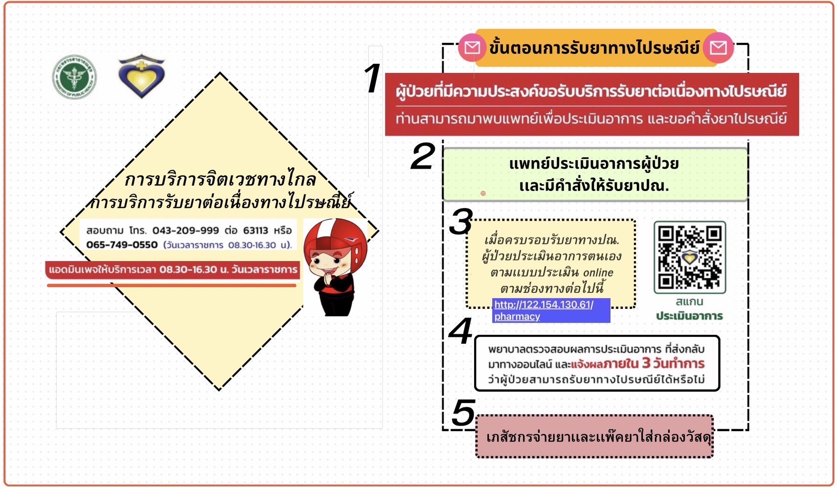 1. กดไปที่ รับยาต่อเนื่องทางไปรษณีย์. ป้อนเลข ID 13 หลัก 2.สำหรับผู้ที่เคยมีประวัติกับโรงพยาบาลแล้วเท่านั้น 3.กรณีชาวต่างชาติ ให้ท่านกรอกหมายเลขพลาสสปอร์ส เพื่อขอรับยาทางไปรษณีย์ (ตัวอักษรพิมพ์ เล็ก- ใหญ่) มีผลต่อการค้นหา Please Enter Your Plasporse Number. 4.ติดต่อสอบถาม แจ้งชำระค่าบริการ กดที่ ติดต่อ สอบถามข้อมูลเพิ่มเติม facebook page