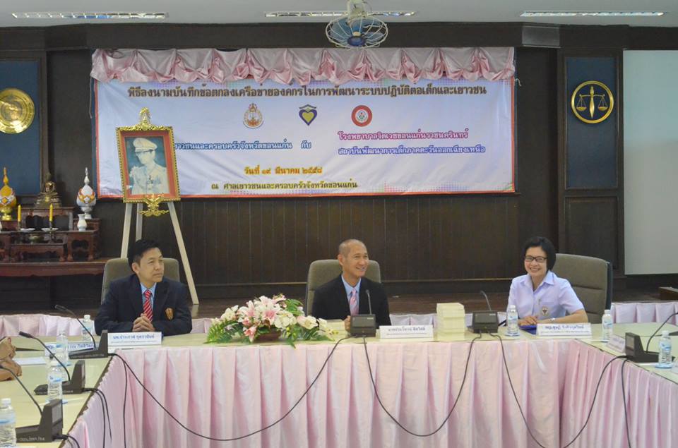 ผู้พิพากษาหัวหน้าศาลเยาวชนและครอบครัวจังหวัดขอนแก่น ร่วมบันทึกข้อตกลงกับ นายแพทย์ประภาส อุครานันท์ ผู้อำนวยการโรงพยาบาลจิตเวชขอนแก่นราชนครินทร์ พร้อมด้วย แพทย์หญิงดุษฏี จึงศิรกุลวิทย์ ผู้อำนวยการสถาบันพัฒนาการเด็กภาคตะวันออกเฉียงเหนือ