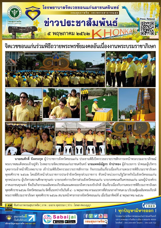 นายสมศักดิ์ จังตระกุล ผู้ว่าราชการจังหวัดขอนแก่น ประธานพิธีเปิดกรวยถวายราชสักการะหน้าพระบรมฉายาลักษณ์พระบาทสมเด็จพระเจ้าอยู่หัว โรงพยาบาลจิตเวชขอนแก่นราชนครินทร์ นายแพทย์ณัฐกร จำปาทอง ผู้อำนวยการ นำคณะผู้บริหาร บุคลากรเจ้าหน้าที่โรงพยาบาล เข้าร่วมพิธีเปิดกรวยถวายราชสักการะ กิจกรรมอันเกี่ยวเนื่องกับงานพระราชพิธีบรมราชาภิเษก พุทธศักราช ๒๕๖๒ โดยมีหัวหน้าส่วนราชการประจำจังหวัดทุกส่วนราชการ หัวหน้าหน่วยงานรัฐวิสาหกิจในจังหวัดขอนแก่นทุกหน่วยงาน ผู้บริหารสถานศึกษาทุกแห่ง นายกองค์การบริหารส่วนจังหวัดขอนแก่น นายกเทศมนตรีนครขอนแก่น และผู้นำองค์กรภาคเอกชนทุกแห่ง ซึ่งเป็นกิจกรรมเฉลิมพระเกียรติและแสดงออกถึงความจงรักภักดี อันเกี่ยวเนื่องกับงานพระราชพิธีบรมราชาภิเษก พุทธศักราช ๒๕๖๒ จังหวัดขอนแก่น จัดขึ้นระหว่างวันวันที่ ๔ - ๖ พฤษภาคม ตามแนวทางที่ส่วนกลางกำหนด ณ บริเวณซุ้มเฉลิมพระเกียรติพระราชพิธีบรมราชาภิเษก พุทธศักราช ๒๕๖๒ สนามหน้าศาลากลางจังหวัดขอนแก่น เมื่อวันอาทิตย์ที่ ๕ พฤษภาคม ๒๕๖๒