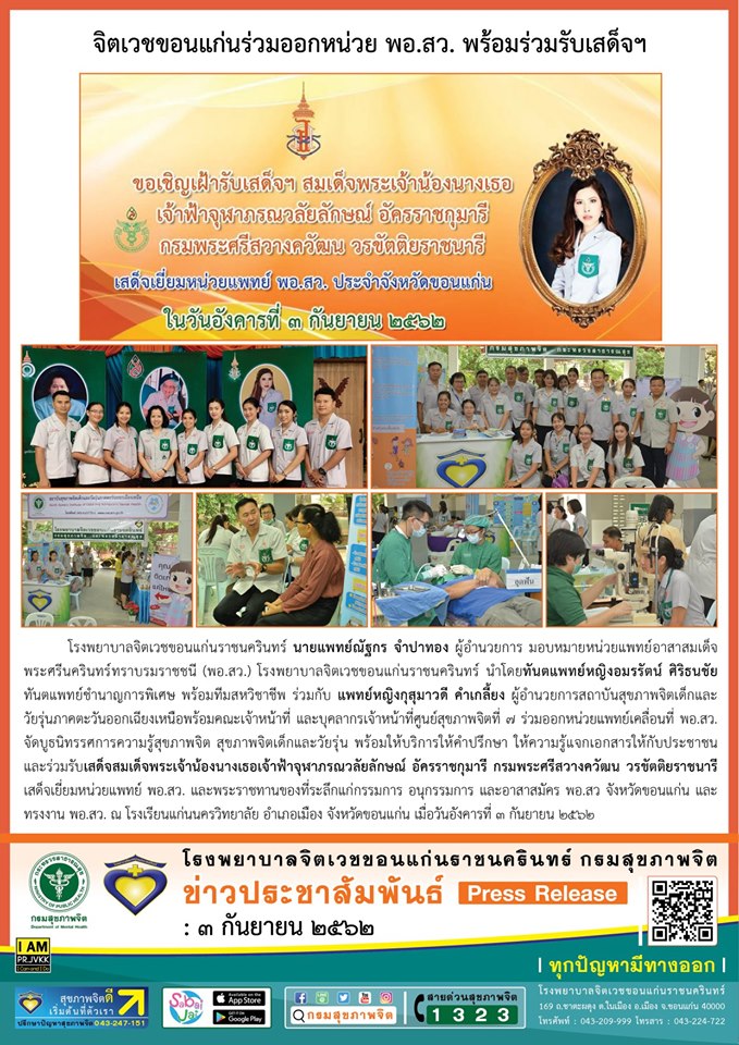 โรงพยาบาลจิตเวชขอนแก่นราชนครินทร์ นายแพทย์ณัฐกร จำปาทอง ผู้อำนวยการ มอบหมายหน่วยแพทย์อาสาสมเด็จพระศรีนครินทร์ทราบรมราชชนี (พอ.สว.) โรงพยาบาลจิตเวชขอนแก่นราชนครินทร์ นำโดยทันตแพทย์หญิงอมรรัตน์ ศิริธนชัย ทันตแพทย์ชำนาญการพิเศษ พร้อมทีมสหวิชาชีพ ร่วมกับ แพทย์หญิงกุสุมาวดี คำเกลี้ยง ผู้อำนวยการสถาบันสุขภาพจิตเด็กและวัยรุ่นภาคตะวันออกเฉียงเหนือพร้อมคณะเจ้าหน้าที่ และบุคลากรเจ้าหน้าที่ศูนย์สุขภาพจิตที่ 7 ร่วมออกหน่วยแพทย์เคลื่อนที่ พอ.สว. จัดบูธนิทรรศการความรู้สุขภาพจิต สุขภาพจิตเด็กและวัยรุ่น พร้อมให้บริการให้คำปรึกษา ให้ความรู้แจกเอกสารให้กับประชาชน และร่วมรับเสด็จสมเด็จพระเจ้าน้องนางเธอเจ้าฟ้าจุฬาภรณวลัยลักษณ์ อัครราชกุมารี กรมพระศรีสวางควัฒน วรขัตติยราชนารี เสด็จเยี่ยมหน่วยแพทย์ พอ.สว. และพระราชทานของที่ระลึกแก่กรรมการ อนุกรรมการ และอาสาสมัคร พอ.สว จังหวัดขอนแก่น และทรงงาน พอ.สว. ณ โรงเรียนแก่นนครวิทยาลัย อำเภอเมือง จังหวัดขอนแก่น เมื่อวันอังคารที่ 3 กันยายน 2562