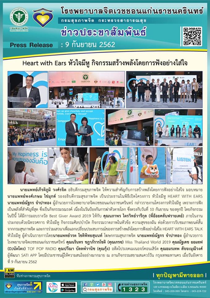 กรมสุขภาพจิต ร่วมกับ Miss Thailand World และเครือข่ายจิตอาสาผู้ฟังที่ดี ร่วมจัดกิจกรรมรณรงค์ป้องกันการฆ่าตัวตาย โครงการ “หัวใจมีหู” เนื่องในวันป้องกันการฆ่าตัวตายโลก ซึ่งตรงกับวันที่ 10 กันยายนของทุกปี เพื่อรณรงค์ให้คนในสังคมรับบทบาทของการเป็นผู้ฟังที่ดี โดยเริ่มต้นจากการรับฟังคนในครอบครัว คนใกล้ชิด ให้ได้ระบายความเครียด ความทุกข์ในใจ ให้มีกำลังใจในการใช้ชีวิตมากขึ้น ส่งผลให้ลดการสูญเสีย และลดอัตราการฆ่าตัวตายในสังคมไทย