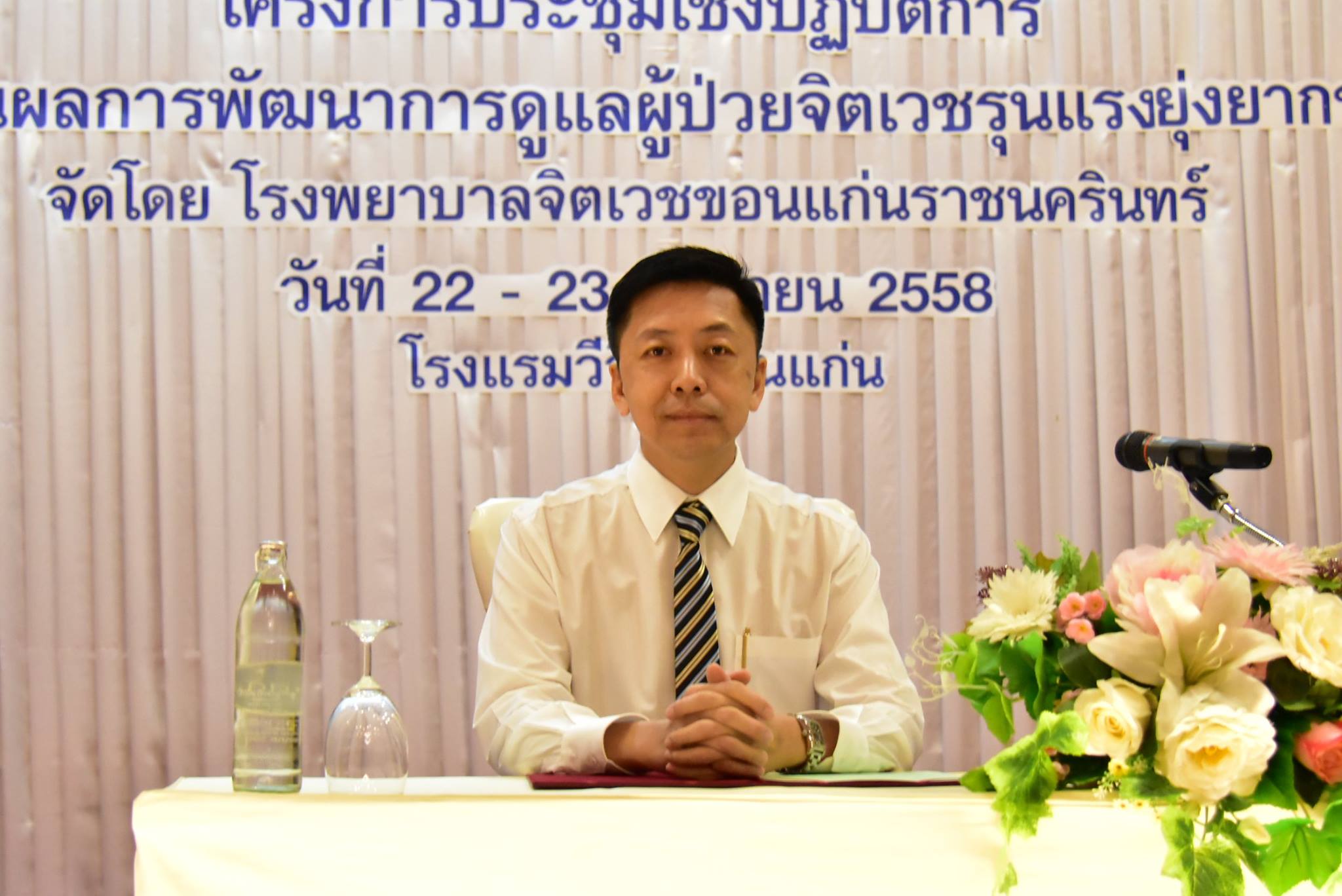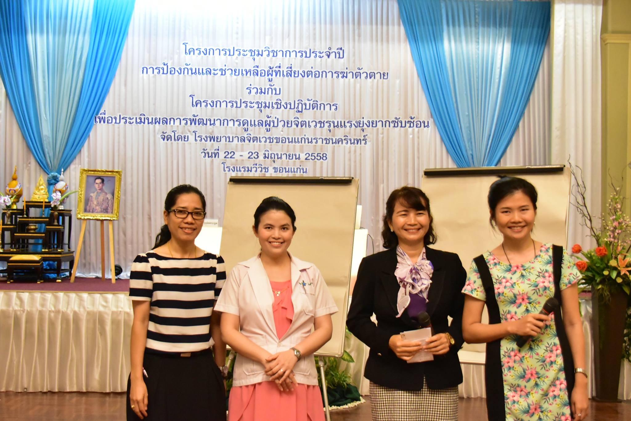 โรงพยาบาลจิตเวชขอนแก่นราชนครินทร์ ในวันที่ 22-23 มิถุนายน 2558 ณ ห้องประชุมแก่นนครา 3 โรงแรมวีวิช จังหวัดขอนแก่น โดยมี นายแพทย์ประภาส อุครานันท์ ผู้อำนวยการโรงพยาบาลจิตเวชขอนแก่นฯ เป็นประธานในพิธีพร้อมแบ่งปันความรู้เรื่อง Suicide in Thailand, Area Health Board เขตสุขภาพที่7 และได้มีการบรรยายโดย ศ.นพ. มาโนช หล่อตระกูล ภาควิชาจิตเวชศาสตร์ คณะแพทย์ศาสตร์ โรงพยาบาลรามาธิบดี และมีวิทยากรที่มาบรรยายในวันจันทร์ที่ 22 มิถุนายน 2558 ได้แก่ พญ. โชติมา ครบตระกูลชัย นายแพทย์ชำนาญการพิเศษ , อ.เอมหทัย ศรีจันทร์หล้า พยาบาลวิชาชีพชำนาญการ, อ.สุบิน สมีน้อย พยาบาลวิชาชีพชำนาญการ, อ.วิภาดา คณะไชย พยาบาลวิชาชีพชำนาญการ, อ.บุญเรือง ร่วมแก้ว พยาบาลวิชาชีพชำนาญการ การประชุมครั้งนี้ได้มีบุคลากรในเขตบริการสุขภาพที่7 ร้อยแก่นสารสินธุ์ ได้แก่ จังหวัดร้อยเอ็ด จังหวัดขอนแก่น จังหวัดกาฬสินธุ์ และจังหวัดมหาสารคาม ได้มาเข้าร่วมประชุมกันอย่างมากมาย การประชุมนี้เป็นการแลกเปลี่ยนความรู้ในการพัฒนาการดูแลผู้ป่วยจิตเวชในรูปแบบต่างๆ ที่หลากหลาย โดยเฉพาะการป้องกันและช่วยเหลือผู้ที่เสี่ยงต่อการฆ่าตัวตายรวมทั้งประเมินผลการพัฒนาการดูแลผู้ป่วยจิตเวชและแลกเปลี่ยนเรียนรู้ เพื่อให้เกิดองค์ความรู้ที่สามารถนำไปใช้ได้จริงในหน่วยงาน ในช่วงบ่ายของการประชุมได้มีกิจกรรม Mind remedy Work Shop ในหัวข้อ รู้เรารู้เขาพัฒนาใจตามแนวคิด Satir และ เคล็ดลับสู่การเป็นนักการปรึกษา (ขั้นเทพ) โดยกิจกรรมการประชุมในวันแรกนี้ ทางผู้เข้าร่วมประชุมต่างได้รับทักษะและความรู้อย่างเต็มเปี่ยม และพร้อมที่จะนำไปปฏิบัติต่อยอดต่อไป