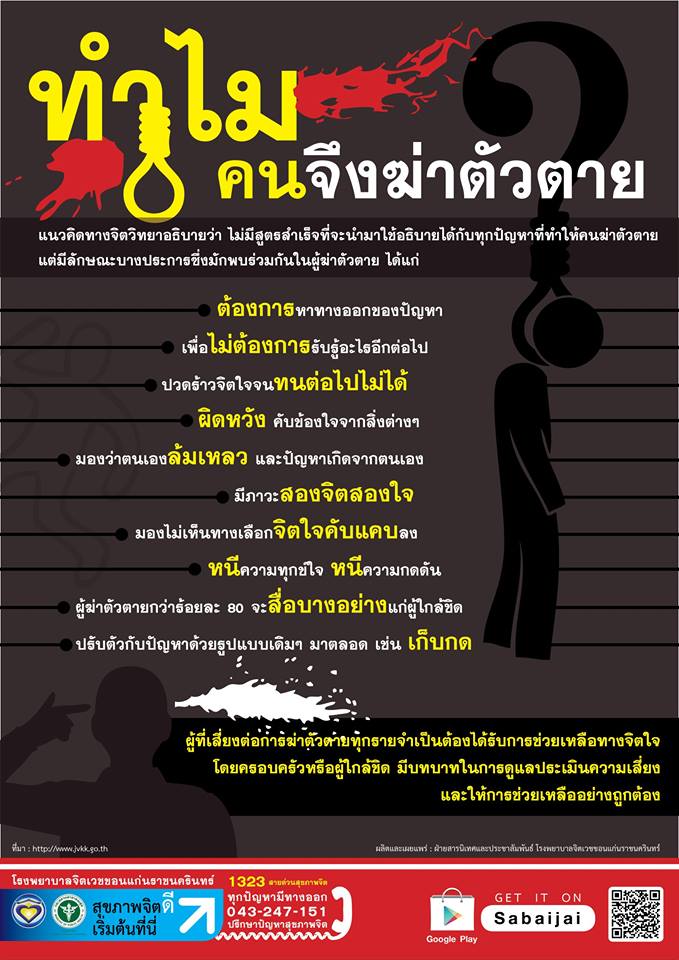 แนวคิดทางจิตวิทยาอธิบายว่า การฆ่าตัวตายไม่มีสูตรสำเร็จ แต่ละรายนั้นมีความเฉพาะตัวแตกต่างกันออกไป มีลักษณะบางประการที่พบร่วมกันในผู้ที่ฆ่าตัวตาย ได้แก่ - ต้องการหาทางออกของปัญหา การฆ่าตัวตายมิใช่สิ่งที่จู่ๆ ก็เกิดขึ้นโดยไม่มีเป้าหมาย หากแต่มีที่มาจากปัญหา ความยุ่งยากสับสน หรือภาวะวิกฤติที่แก้ไขไม่ได้ การฆ่าตัวตายจึงเป็นคำตอบ และสำหรับผู้ที่ฆ่าตัวตายแล้ว *สิ่งนี้เป็นเพียงทางออกเดียวที่เขามองเห็นในขณะนั้น - เพื่อจะได้ไม่ต้องรับรู้อะไรอีก ผู้ฆ่าตัวตายมองว่าตนเองมีแต่ความทุกข์ทรมาน ปวดร้าวจนทนไม่ไหว ไม่ต้องการรับรู้อะไรอีกต่อไป *การหยุดรับรู้สิ่งต่างๆ เป็นทางออกที่ดีที่สุดต่อสิ่งที่เกิดขึ้น - ความทุกข์ทรมานใจจนทนไม่ได้ การฆ่าตัวตายอาจไปสู่ภาวะที่ไม่ต้องรรับรู้อะไร เป็นการหนีไปจากความปวดร้าวทางจิตใจ *ไม่มีใครฆ่าตัวตายขณะมีความสุข - ความผิดหวัง ไม่สมหวัง คับข้องใจจากสิ่งต่างๆ ที่ไม่เป็นไปตามที่ต้องการ ผู้ที่ตั้งความหวังไว้สูงจะมีความเสี่ยงหากผิดหวัง มักมองว่าปัญหาเกิดจากตนเอง ว่าตนเองเป็นคนล้มเหลว ในวัยรุ่นความต้องการทางจิตใจอาจเป็นเรื่องความรัก การเรียน ในวัยผู้ใหญ่อาจเป็นเรื่องการงาน *หากความต้องการไม่ได้รับการตอบสนองนำมาสู่ความคับข้องใจมากขึ้น อาจเกิดการฆ่าตัวตายตามมาในที่สุด - ความรู้สึกสิ้นหวัง อะไรก็ช่วยไม่ได้ ผู้ฆ่าตัวตายมักรู้สึกว่าตนเองไม่สามารถทำอะไรได้อีกต่อไป *หมดหนทางที่จะมีใครช่วยเหลือออกจากความทุกข์ทรมานนี้ได้ - มีภาวะสองจิตสองใจ อาจกินยาเกินขนาดโดยอยากตายจริง *ในขณะเดียวกันก็ต้องการให้ผู้อื่นมาช่วยเหลือตนเอง - มีมุมมองต่อสิ่งต่างๆ แคบลง อารมณ์และการรับรู้การตัดสินใจคับแคบลง *มองไม่เห็นทางเลือกหรือคำอธิบายอื่นๆ นอกจากความตาย - หนีจากความทุกข์ใจ เพื่อออกไปจากความกดดัน *การฆ่าตัวตายเป็นการหนีครั้งสุดท้าย - สื่อถึงความตั้งใจในการกระทำ ผู้ฆ่าตัวตายกว่าร้อยละ 80 มักมีการสื่อบางอย่างแก่ผู้ใกล้ชิด เพื่อบอกว่าตนเองต้องการตาย *การสื่อนี้อาจโดยทางคำพูด ท่าทาง หรือการกระทำ - ใช้รูปแบบเดิมๆ ในการปรับตัวกับปัญหามาตลอด โดยเฉพาะรูปแบบการปรับตัวกับความกดดัน ความทุกข์ใจ และความล้มเหลว *เมื่อมีปัญหาจะใช้วิธีเก็บกด ไม่ยอมปรึกษาขอความช่วยเหลือ #ทุกปัญหามีทางออก #ปรึกษาปัญหาสุขภาพจิต (24 ชั่วโมง) 043-247-151 #สายด่วนสุขภาพจิต (ฟรี 24 ชั่วโมง) 1323 ระบบแอนดรอย : ดาวน์โหลดแอพพลิเคชั่น #สบายใจ