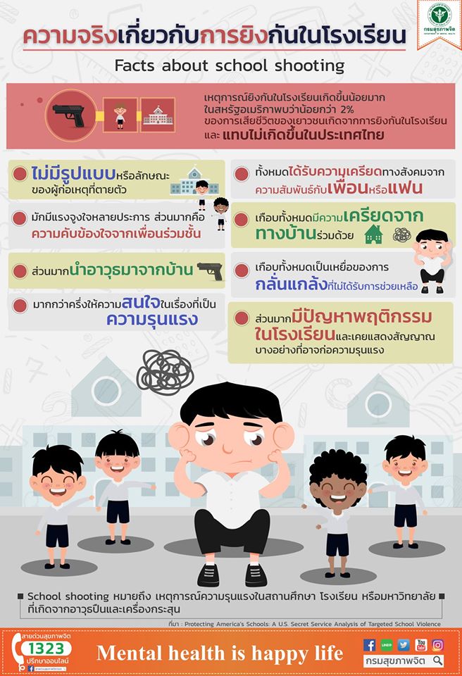 เหตุการณ์ยิงกันในโรงเรียนเป็นเหตุโศกนาฏกรรมที่เกิดขึ้นน้อยมาก ในสหรัฐอเมริกาที่มีเหตุการณ์ school shooting มากที่สุดประเทศหนึ่งในโลก พบว่าน้อยกว่า 2% ของการเสียชีวิตของเยาวชนเกิดจากการยิงกันในโรงเรียน แต่สำหรับในประเทศไทยแล้ว เหตุการณ์เช่นนี้แทบไม่เคยเกิดขึ้นเลย School shooting หมายถึง เหตุการณ์ความรุนแรงในสถานศึกษา โรงเรียน หรือมหาวิทยาลัย ที่เกิดจากอาวุธปืนและเครื่องกระสุน